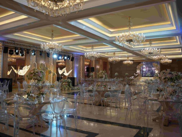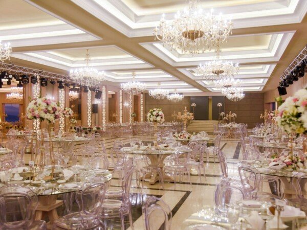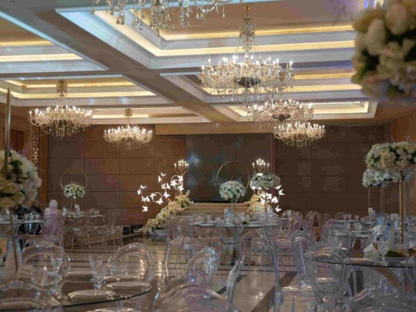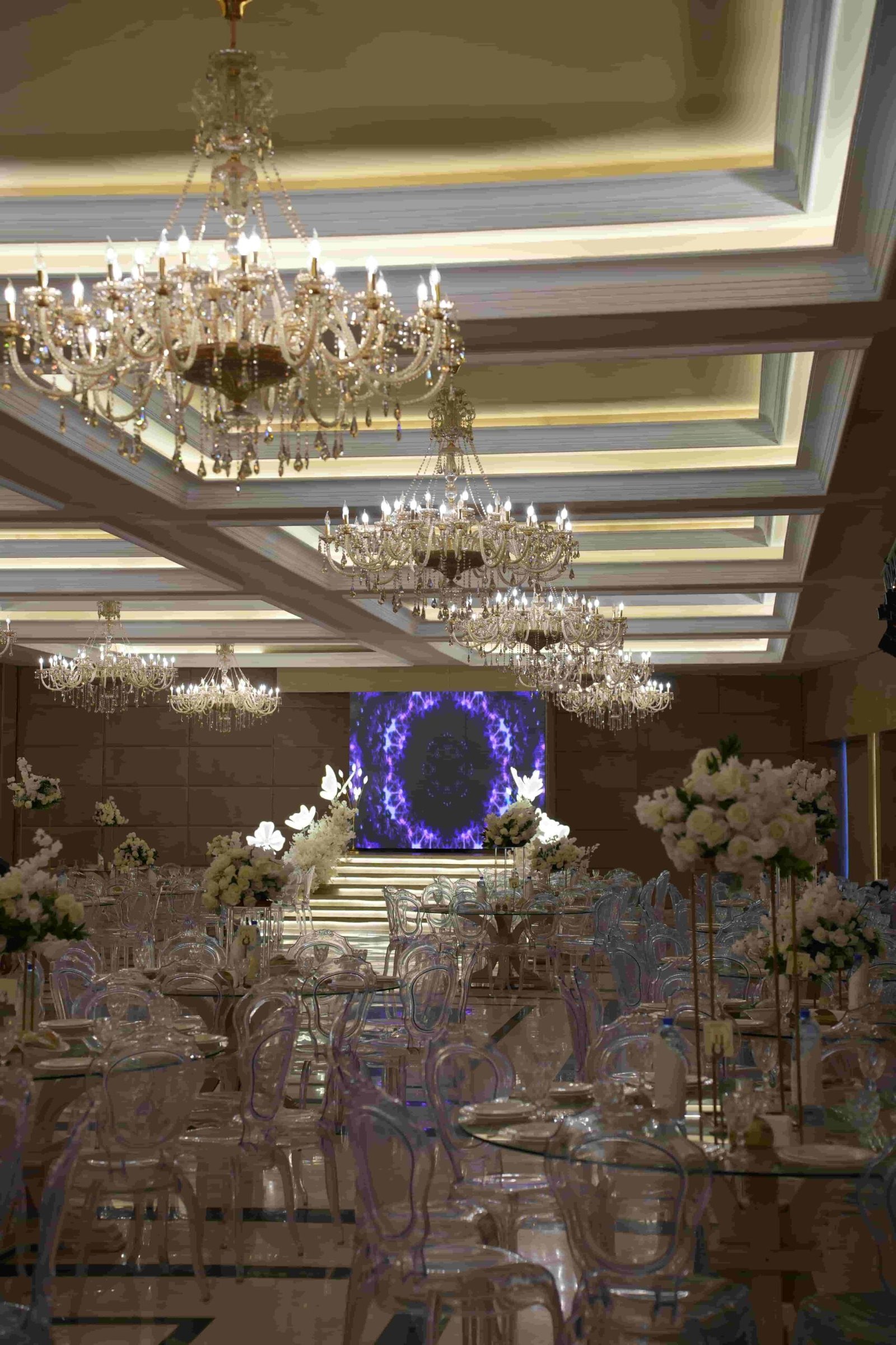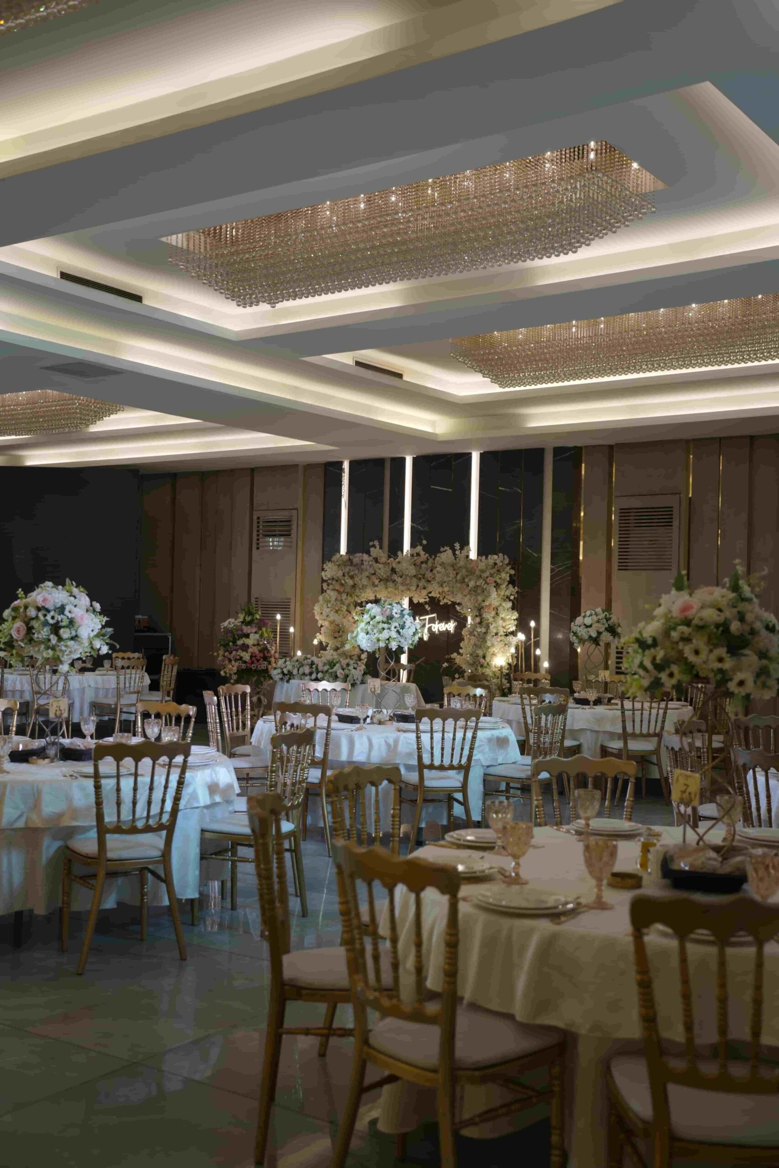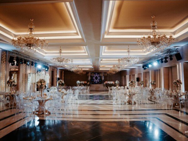 A grand indoor ballroom defined by crystal chandeliers, warm lighting, and refined luxury designed for timeless, elegant celebrations.