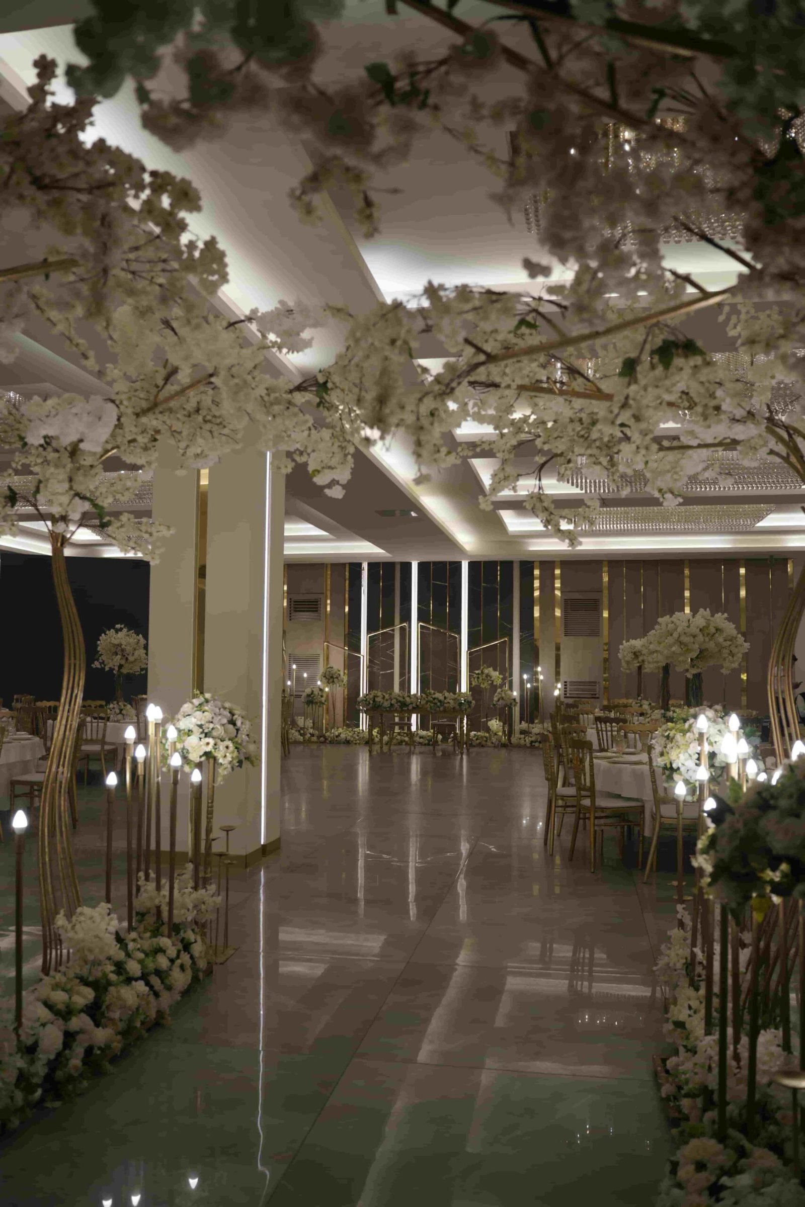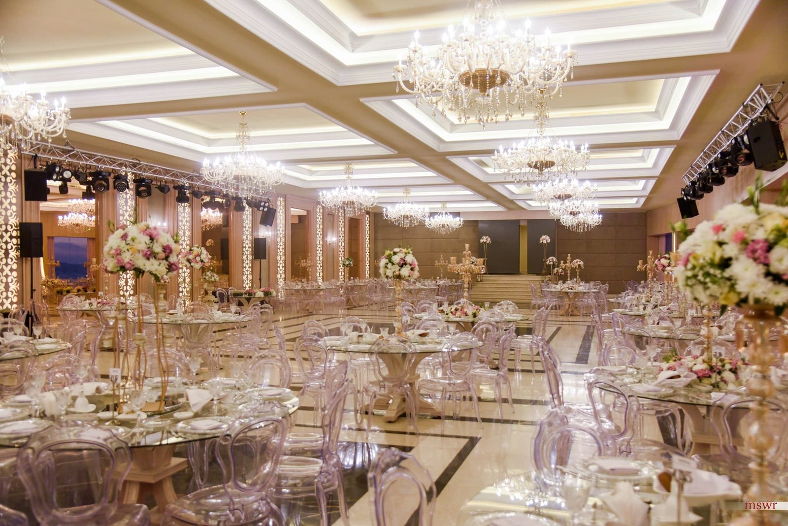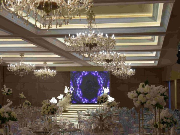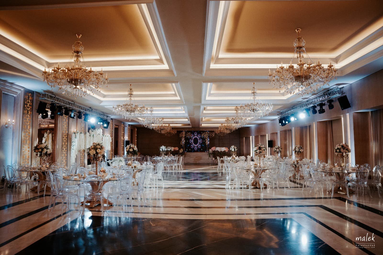 A grand indoor ballroom defined by crystal chandeliers, warm lighting, and refined luxury designed for timeless, elegant celebrations.