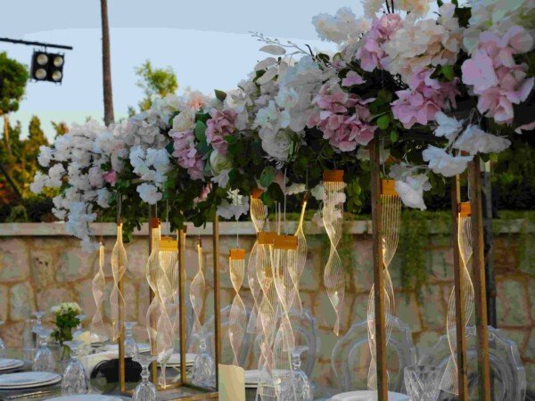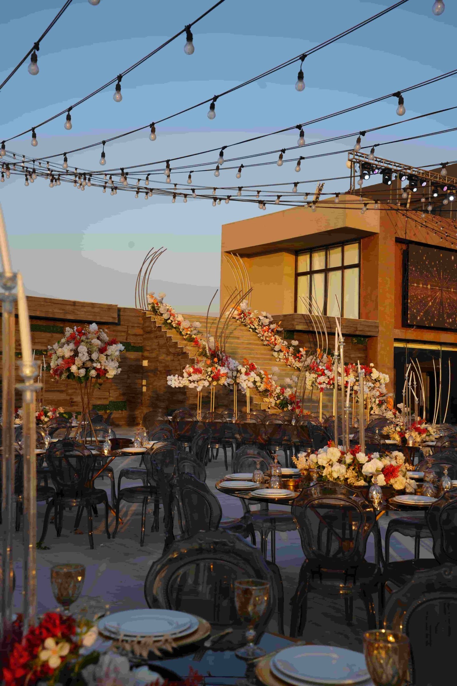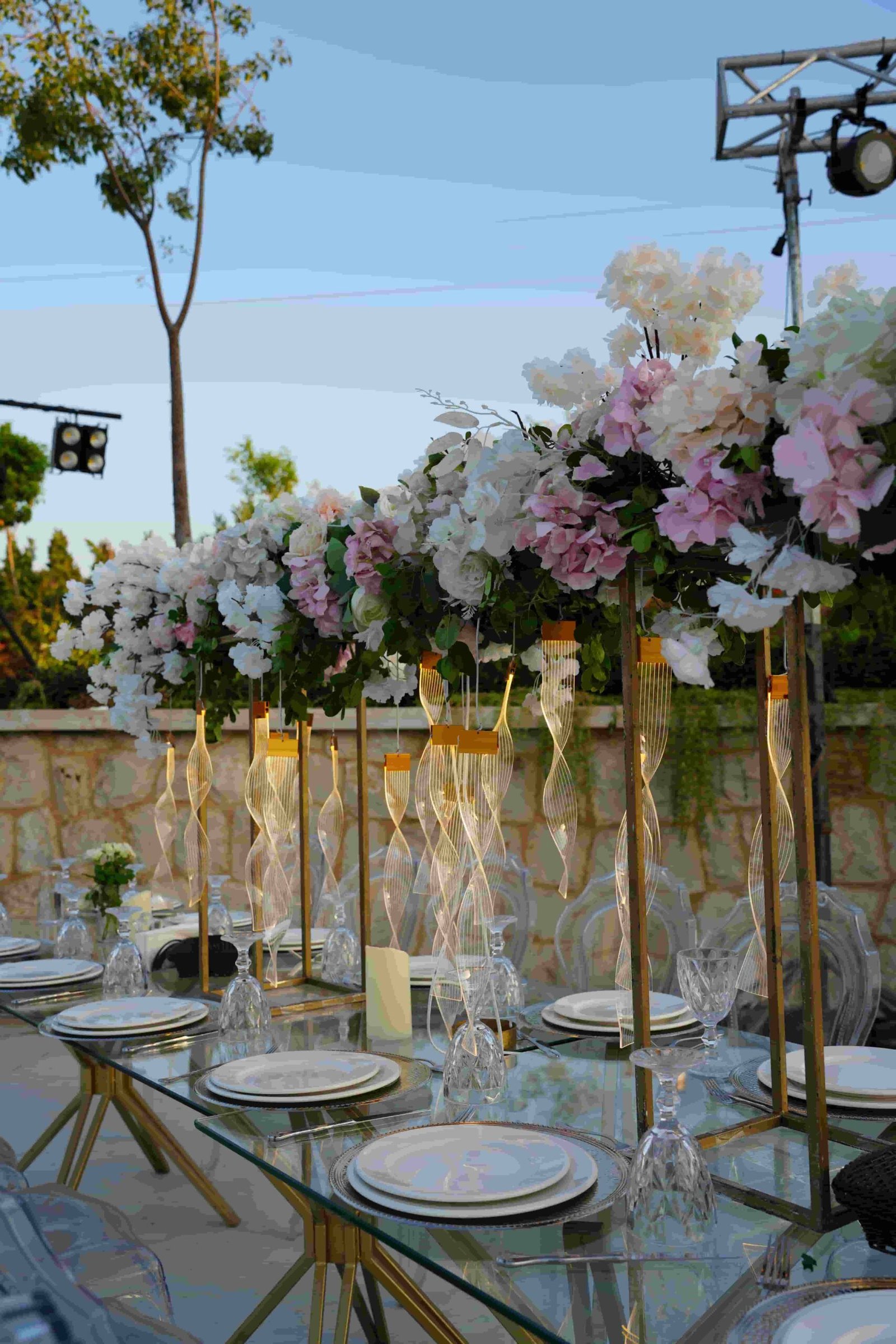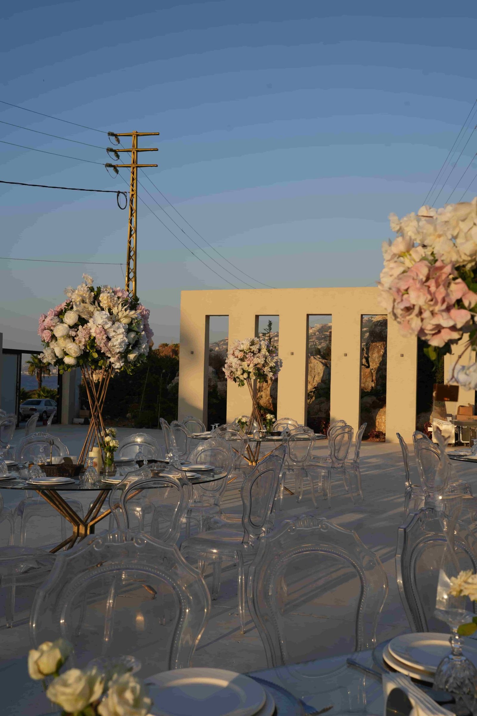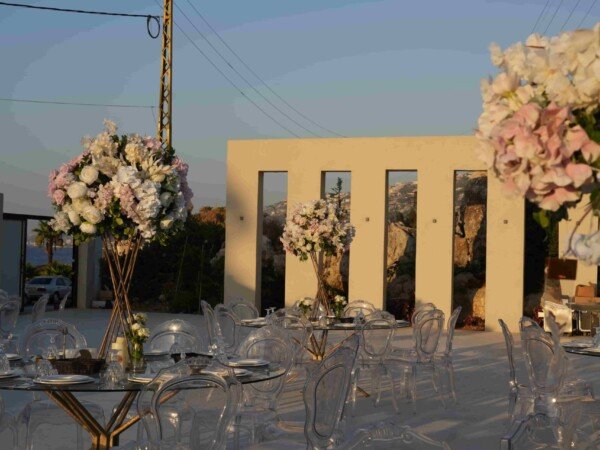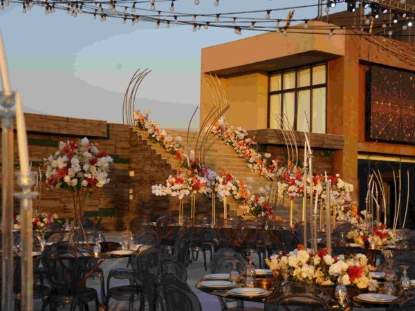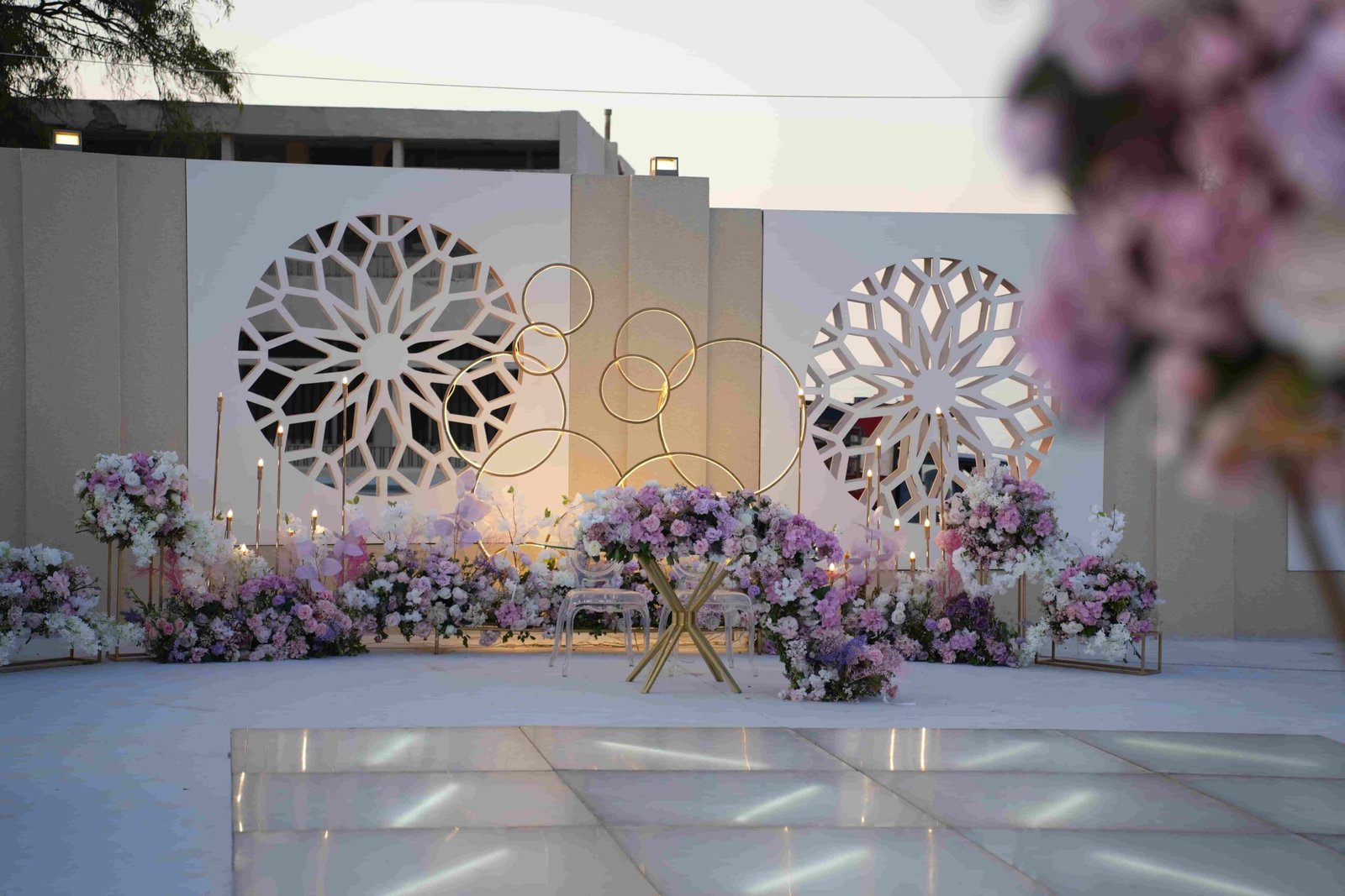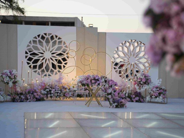 An open-air venue with modern lines and floral accents, blending soft elegance with a serene outdoor ambiance.